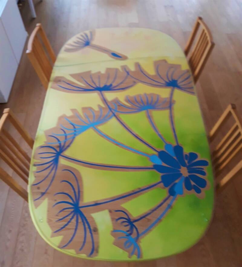 Table de salle à manger en bois sur laquelle j'ai directement peins un motif d'inspiration florale.